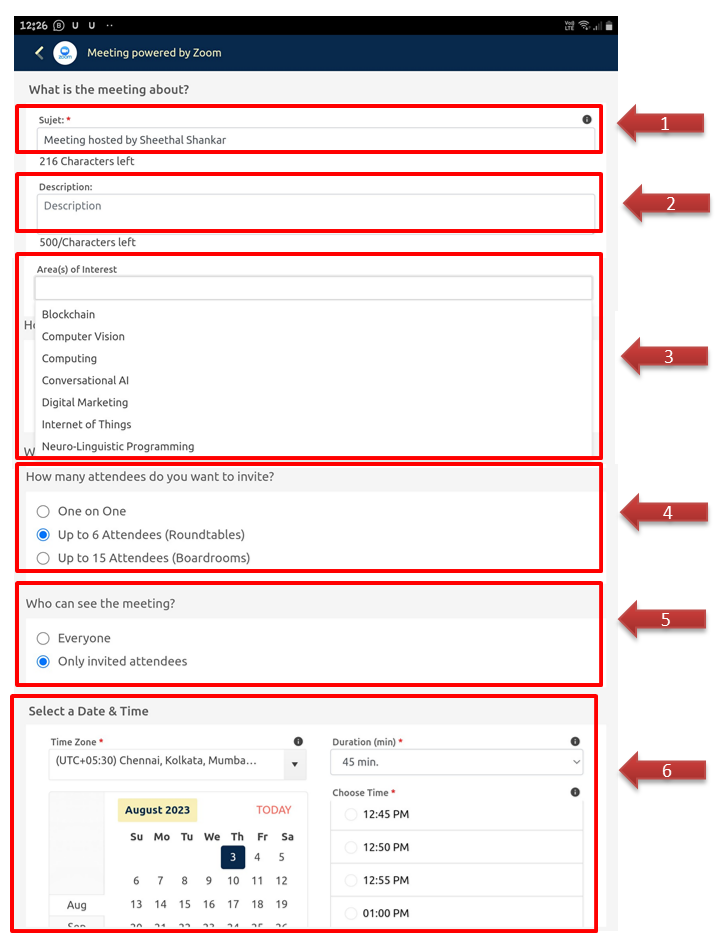 Date & Time Selection: Choose the meeting date from the calendar and set the duration and time accordingly.